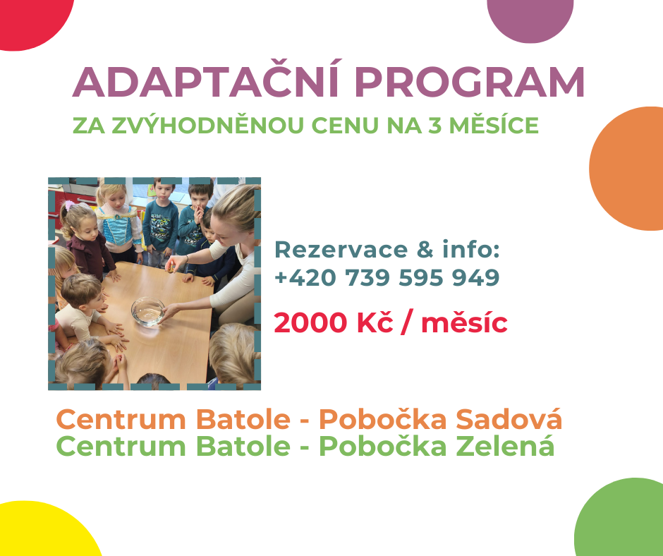 Pro rodiče, kteří chtějí svým dětem dopřát postupné začlenění do kolektivu s individuálním přístupem, jsme připravili jedinečný adaptační program na 3 měsíce za zvýhodněnou cenu 2 000 Kč/měsíc. Co je adaptační program? Adaptační program je speciálně navržený pro děti, které se poprvé setkávají s kolektivem vrstevníků a potřebují si postupně zvyknout na nové prostředí. V Centru Batole klademe důraz na klidné tempo, individuální přístup a pohodovou atmosféru, ve které se děti cítí bezpečně a sebevědomě. Pro koho je program určen? Program je vhodný pro děti od 1 roku, které ještě nenavštěvují státní mateřské školy nebo se teprve chystají do předškolního vzdělávání. Cílem je, aby si dítě pomalu navyklo na nové prostředí, kamarády i pravidelný režim. Jak adaptační proces probíhá? Výhody adaptačního programu (délka 3 měsíce): Kde adaptační program probíhá? Centrum Batole nabízí tento program na obou našich pobočkách: 📍 Třinec – Sadová 139 📍 Třinec – Zelená 837 Rezervace a více informací: Pro rezervaci místa nebo bližší informace nás neváhejte kontaktovat: 📞 Telefon: +420 739 670 919 ✉️ E-mail: info@centrumbatole.cz Přihlaste své dítě do našeho adaptačního programu a dopřejte mu klidný a bezpečný start mezi nové kamarády! 😊