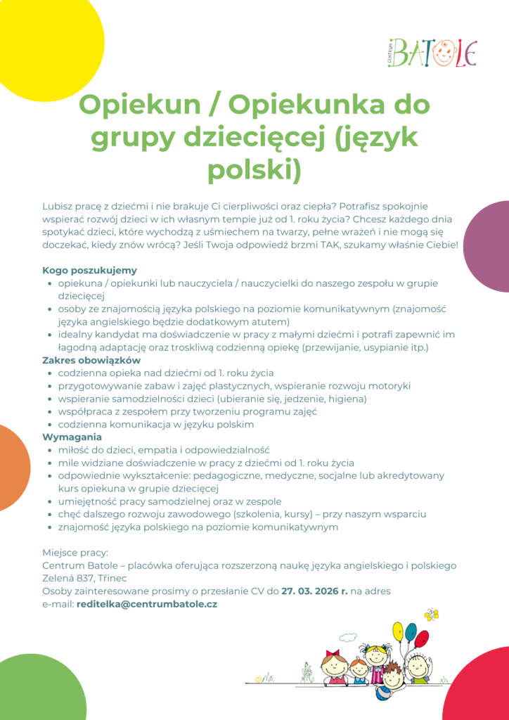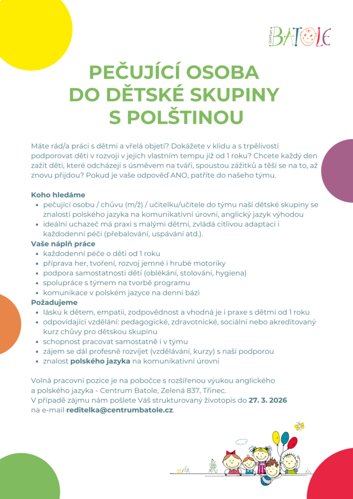 Máte rád/a práci s dětmi a vřelá objetí? Dokážete v klidu a s trpělivostí podporovat děti v rozvoji v jejich vlastním tempu již od 1 roku? Chcete každý den zažít děti, které odcházejí s úsměvem na tváři, spoustou zážitků a těší se na to, až znovu přijdou? Pokud je vaše odpověď ANO, patříte do našeho týmu.